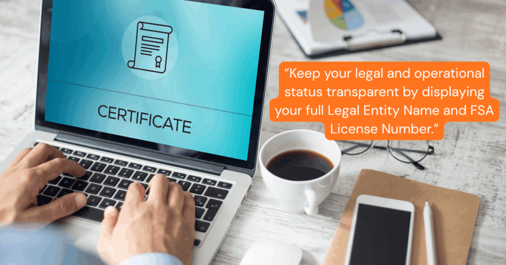 - Action: Clearly display the full Legal Entity Name, FSA License Number (e.g., SD0XX), and Registered Address in the website footer and the Legal/About Us section. Ensure every trade name used on the site is officially approved by the FSA.